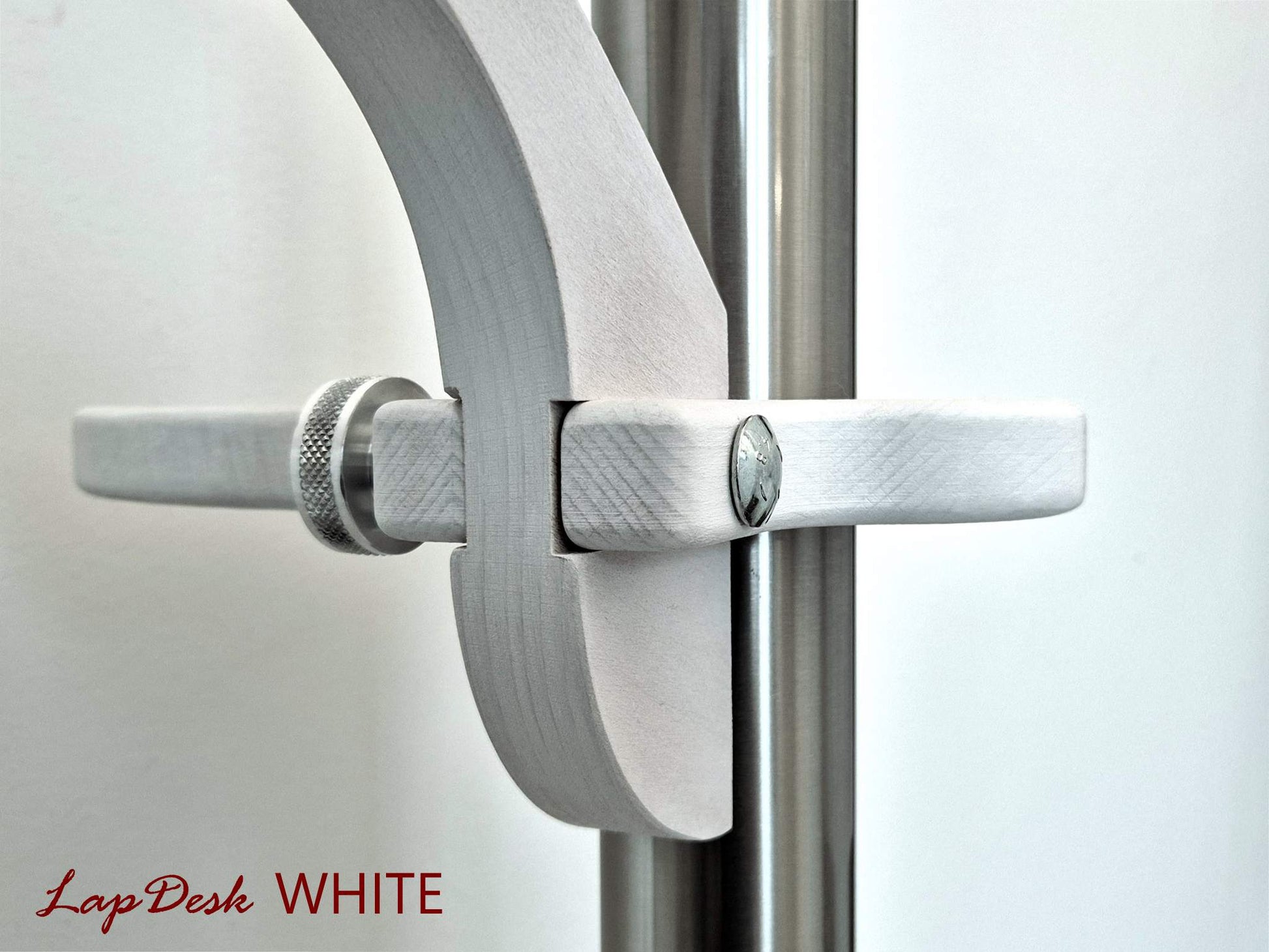 Die Form ist nie zufällig: Jede Kurve, Verbindung und Oberfläche wurde so gestaltet, dass sie sich an den Körper und die Umgebung anpasst . Der Hauptarm ist drehbar und in der Höhe verstellbar, das kippbare Tablett folgt Ihrem Blick, während die Seitenablage rechts oder links montiert werden kann, für Rechts- oder Linkshänder.